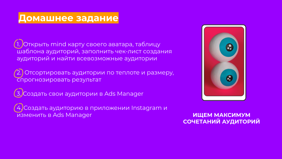 Презентация урока - скачать тут Чек-лист для создания аудиторий в таргете - тут Шпаргалка аудиторий в таргете - тут 10 готовых интересов в тагерте - тут Mind-карта аудиторий в таргете - тут Гайд по выбору аудитории - тут